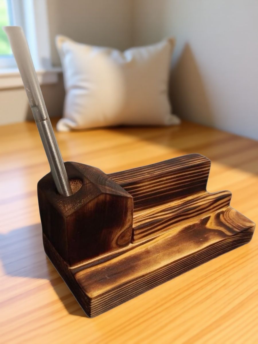 Элегантная деревянная подставка выполнена в теплом шоколадном оттенке, который органично впишется в интерьер офиса или дома. Её прочная конструкция идеально подходит для упорядочивания рабочего пространства: удобно размещайте ручку, визитки или заметки в одном месте.Материал натурального происхождения обеспечивает долговечность и приятную текстуру поверхности. Компактные размеры позволяют использовать подставку даже на небольших столах без потери функциональности.Простой дизайн сочетается с любыми стилями оформления, добавляя помещению уюта и порядка. Подставка станет полезным аксессуаром для тех, кто ценит эстетику и практичность в повседневных решениях.