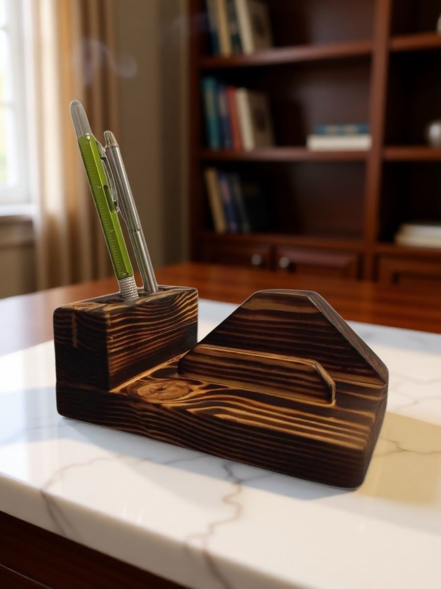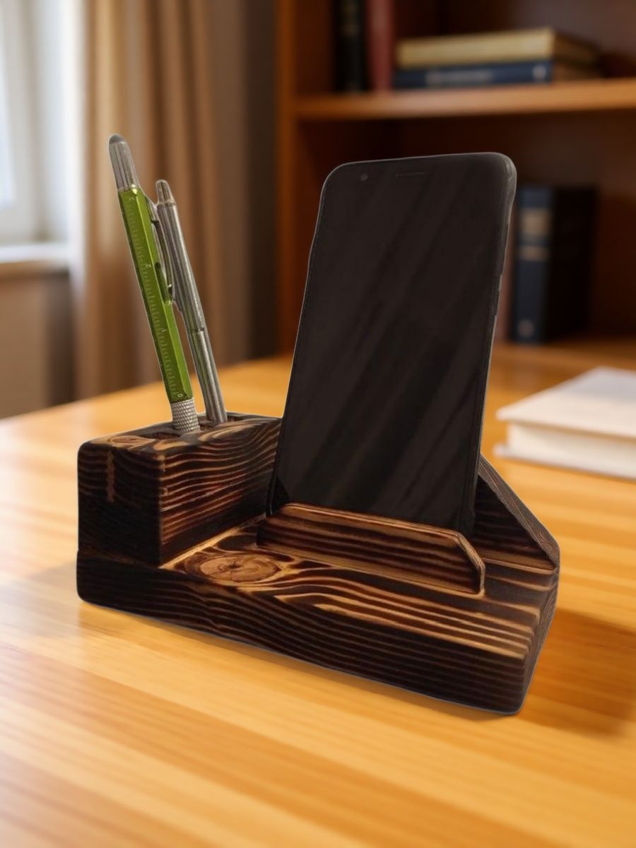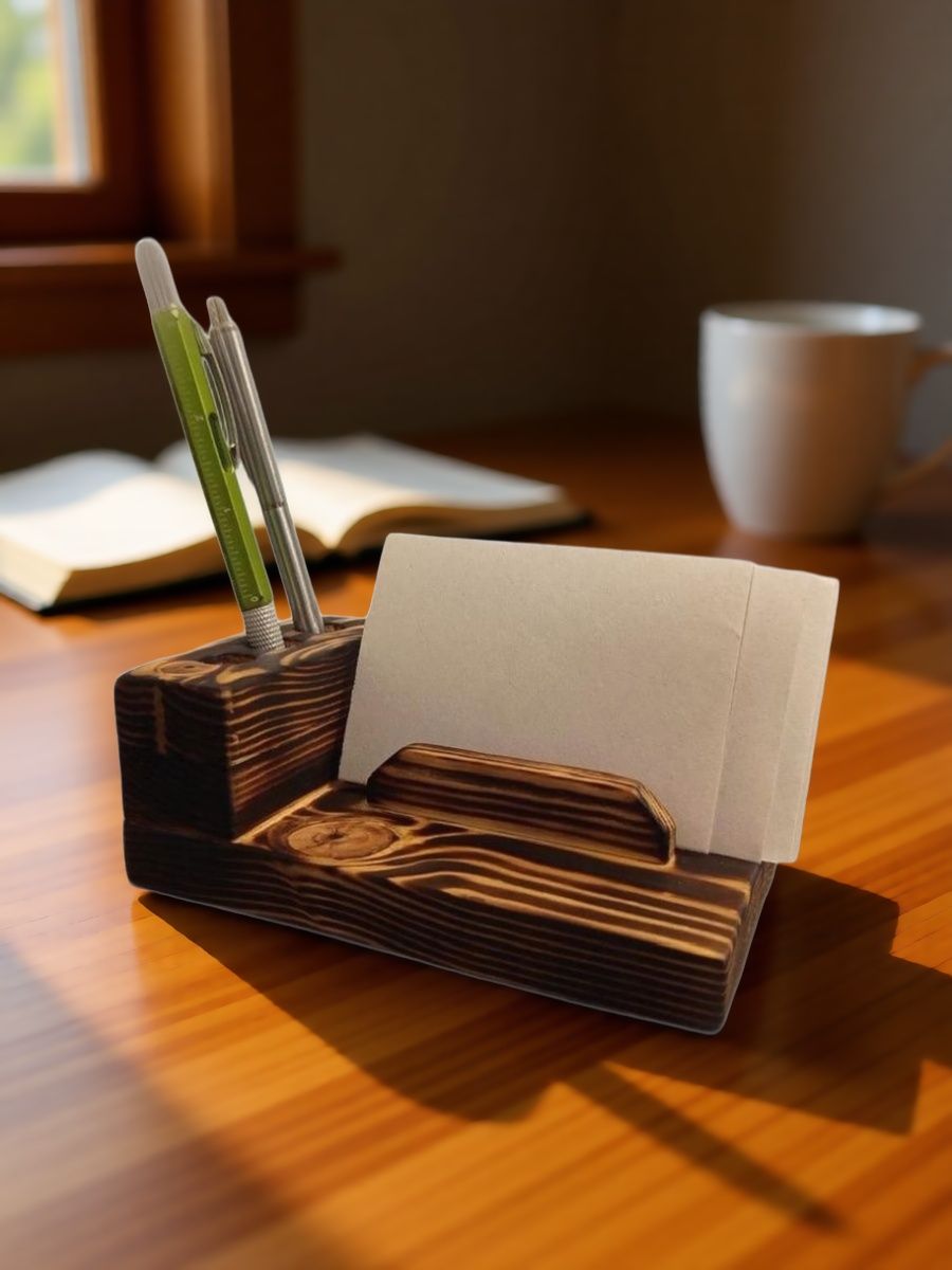 Элегантная деревянная подставка выполнена в теплом шоколадном оттенке, имитирующем обоженную древесину. Ее минималистичный дизайн идеально впишется в интерьер дома или рабочего пространства.Практичная конструкция позволяет аккуратно размещать визитки, смартфон и другие мелкие предметы на столе. Компактные размеры обеспечивают удобство использования даже на ограниченных поверхностях.Изделие изготавливается из прочного материала, сохраняющего естественные текстуры дерева. Легкий вес и устойчивая форма гарантируют надежную фиксацию содержимого.